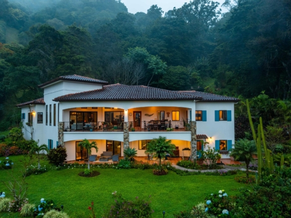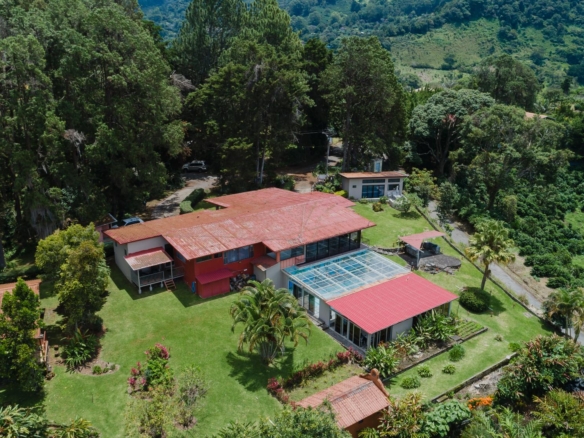 Rodeada por un Parque Nacional, esta extraordinaria finca fue construida con técnicas tradicionales francesas. Ofrece vistas perfectas del gran Barú y exuberantes suelos en las altitudes más altas del codiciado Boquete. La propiedad posee los derechos documentados de un manantial de gran altitud, así como de otros dos manantiales dentro de sus límites. Con una imponente vista del Barú y de las llanuras que se extienden hasta el Pacífico, esta residencia exhibe una arquitectura audaz pero integrada con el medio ambiente. La residencia principal cuenta con cocina y baño privados en la planta baja, y un dormitorio tipo loft y una oficina en la segunda planta. La notable carpintería está vista y los tonos de la rica madera aportan calidez al concepto abierto. Rodeada por una amplia terraza, hay un amplio espacio al aire libre para disfrutar del aire fresco de la montaña. El edificio común cuenta con una acogedora sala de estar con mesa de comedor de borde natural, chimenea de leña, baño y una cocina de calidad profesional para preparar comidas para los huéspedes y producir cestas para la venta. Siga el sendero de ladrillo que sube y pasa estos edificios hasta llegar a otras mesetas donde se encuentran las tres cabañas. También se puede acceder a las cabañas en vehículo, a través de un camino de grava que atraviesa el centro de la propiedad. Las vistas desde las cabañas son exquisitas y no se ven interrumpidas por los edificios de abajo, gracias a los techos verdes y la topografía natural de la finca. Los diseños son modernos y de líneas limpias, y resultan excepcionalmente acogedores, con acabados importados ornamentados y chimeneas de hierro fundido.